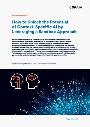 AI for Government er et cBrain-forskningsinitiativ baseret på en sandkassetilgang. En sandkasse er et sikkert kundespecifikt miljø, som simulerer live myndighedsarbejde og sagsbehandling. Sandkassen giver de enkelte offentlige myndigheder mulighed for at undersøge og teste specifikke use cases, mens de bruger deres egne data.
